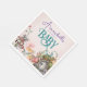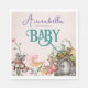 Estas servilletas mágicas y extravagantes de la ducha para bebés presentan una temática forestal encantada. En la parte inferior, se ha colocado una imagen de una puerta de hadas en un pequeño jardín de champiñones, con un hada flameada por encima. En la parte inferior, hay flores y champiñones. El fondo es un patrón rosa descolorido.