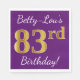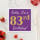 Este sencillo diseño de servilletas de papel muestra un mensaje como "¡El 83 cumpleaños de Betty-Lou!", con el "83" en apariencia de oro falso, en un fondo morado. El nombre se puede personalizar. Podría ser usado en una fiesta de cumpleaños para alguien que está celebrando su cumpleaños número ochenta y tres. [~Z0000085]