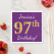 Este sencillo diseño de servilletas de papel muestra un mensaje como "¡El cumpleaños 97 de Jessica!", con el "97" en falso aspecto dorado, sobre un fondo morado. El nombre se puede personalizar. Podría ser usado en una fiesta de cumpleaños para alguien que está celebrando su cumpleaños noventa y siete. [~Z0000085]