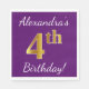 Este sencillo diseño de servilletas de papel muestra un mensaje como "¡El cuarto cumpleaños de Alexandra!", con el "cuarto" en falso aspecto dorado, en un fondo morado. El nombre se puede personalizar. Podría ser usado en una fiesta de cumpleaños para alguien que está celebrando su cuarto cumpleaños. [~Z0000085]