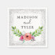 Esta servilleta de moda muestra los nombres de la pareja en un elegante guión negro en la parte superior, y una bonito colorida disposición floral de la corona en la parte inferior. Un purpurina de confeti plateado rompe el borde y el fondo blanco completa el diseño. Esta servilleta se puede personalizar fácilmente con sus nombres personalizados, y es perfecta para un compromiso, boda o aniversario. Incluso puede cambiar el tipo de letra, el color del texto y el estilo del tipo de letra utilizando la opción personalizar.