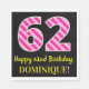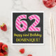 Este divertido diseño de servilletas de papel con temática de cumpleaños presenta un gran número "62" con un patrón de rayas rosa claro y rosa oscuro, junto con el mensaje "Feliz cumpleaños número 62", y un nombre editable. El fondo es negro de color. Unas toallas de papel personalizadas y con temas de cumpleaños como esta podrían ser usadas en la fiesta de cumpleaños número sesenta. [~Z0000380]