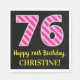 Este divertido diseño de servilletas de papel con temática de cumpleaños presenta un gran número "76", con un patrón de rayas rosa claro y rosa oscuro. También incluye el mensaje "Feliz cumpleaños número 76", y un nombre editable. El fondo es negro de color. Unas toallas de papel personalizadas y divertidas como esta pueden ser usadas en una fiesta de cumpleaños que se celebra para celebrar el cumpleaños 76 de alguien. [~Z0000380]