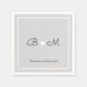 Marco blanco con sus propias iniciales y un pequeño corazón de amor en una servilleta de papel gris pálido.. con texto personalizado 'gracias por celebrar con nosotros'