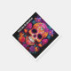 La servilleta tiene una escena cautivadora rebosante de colores vivos en un fondo negro profundo. En su centro, un sorprendente cráneo de azúcar naranja cobra importancia. Sus elaborados diseños y patrones exudan un aire de celebración y recuerdo. Rodeado por el cráneo, se despliega un ramo animado de flores rosadas, violetas y naranjas, creando un caleidoscopio de tonos. Cada pétalo y hoja se detalla meticulosamente, añadiendo a la opulencia general de la composición. El contraste entre los elementos vibrantes y el fondo oscuro crea una imagen visualmente impresionante y emocionalmente resonante. En general, esta servilleta capta maravillosamente la esencia del Día de Muertos con sus colores vibrantes, sus intrincadas obras de arte y su cuidadoso diseño. Sirve como un tributo apropiado para celebrar los recuerdos de los seres queridos.