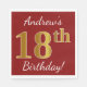 Este sencillo diseño de servilleta de papel muestra un mensaje como "¡18 cumpleaños de Andrew!", con el "18" en falso aspecto dorado, en un fondo de color rojo. El nombre se puede personalizar. Se podría usar en una fiesta de cumpleaños para alguien que esté celebrando su decimoctavo cumpleaños. [~Z0000080]