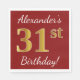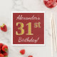 Este sencillo diseño de servilleta de papel muestra un mensaje como "¡El cumpleaños 31 de Alexander!", con el "31" en apariencia falsa de oro, sobre un fondo de color rojo. El nombre se puede personalizar. Podría ser usado en una fiesta de cumpleaños para alguien que está celebrando su cumpleaños número treinta. [~Z0000080]