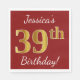 Este sencillo diseño de servilletas de papel muestra un mensaje como "¡El cumpleaños 39 de Jessica!", con el "39" en apariencia falsa de oro, sobre un fondo rojo de color. El nombre se puede personalizar. Se podría usar en una fiesta de cumpleaños para alguien que esté celebrando su cumpleaños número treinta y nueve. [~Z0000080]