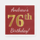 Este sencillo diseño de servilleta de papel muestra un mensaje como "¡76º cumpleaños de Andrew!", con el "76º" en falso aspecto dorado, en un fondo de color rojo. El nombre se puede personalizar. Podría ser usado en una fiesta de cumpleaños para alguien que está celebrando su cumpleaños setenta y seis. [~Z0000080]