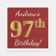 Este sencillo diseño de servilleta de papel muestra un mensaje como "¡El cumpleaños 97 de Andrew!", con el "97" en apariencia falsa de oro, sobre un fondo de color rojo. El nombre se puede personalizar. Podría ser usado en una fiesta de cumpleaños para alguien que está celebrando su cumpleaños noventa y siete. [~Z0000080]