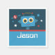 Cuta toallas personalizadas de papel de primer cumpleaños feliz con un robot colorido rodeado de estrellas, con ojos gigantes y antenas en la cabeza. Un planeta tiene un número 1 y un nombre de personalizable. ¡PinkInkArt original!