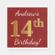 Este diseño simple de servilleta de papel presenta un mensaje como "¡El 14 cumpleaños de Andrew!", con el "14" teniendo una apariencia similar al oro, sobre un fondo de color rojo. El nombre se puede personalizar. Se podría utilizar en una fiesta de cumpleaños para alguien que está celebrando su decimocuarto cumpleaños.