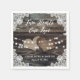 Rústicas servilletas de papel rústico para bodas con dos corazones de bupón y luces de cuerdas en un fondo de madera de granero adornado con encaje floral blanco.