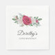 Las rosas y las bayas suaves y rojas crean un marco bellamente rústico. Las hojas de eucalipto y otras flores rojas contribuyen a la vibración botánica de invierno. El nombre de la mujer de cumpleaños está escrito en una letra de guión grande. Esta servilleta es parte de la colección Rosa de cumpleaños y Holly. Contiene muchas plantillas DIY que permiten crear rápidamente invitaciones y suministros de fiesta.