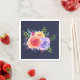 Toallas de papel con un bonito ramo de rosas acuarelas con estampados, hojas y ramas, todo ello en un colorido arreglo floral. Fondo azul marino.
