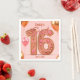 This paper napkin is a vision of elegance for a Sweet 16 celebration. It showcases a striking 3D-effect "Sweet 16" in luxurious rose gold, embellished with dazzling pink gemstones and intricate golden accents. The design is set against a soft blush pink background, completed with delicate floating rose gold balloons. The text is fully customizable, allowing for complete personalization of this stunning and memorable party detail.