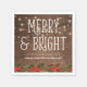 Rústico navidades de vacaciones fiesta las servilletas de la cena con un cálido fondo de madera, luces de cuerda intermitentes, un adorno floral de Navidad, las palabras "MERRY & BRIGHT", saludos de temporada, nombre de su familia y el año.