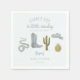 Rústica servilleta de papel para bebés con temática de vaquero que incluye ilustracion de una bota de vaquero, gorra, cactus y serpiente. El texto dice "ensillar a un pequeño vaquero está en camino".