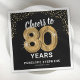 Elegantes servilletas de fiesta de cumpleaños número 80 con un elegante fondo negro que se puede cambiar a cualquier color, purpurina brillante de oro, el dicho "vítores a 80 años" usando ochenta globos de helio de oro, su nombre y la fecha de la celebración.