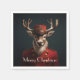 Retrato de un reno vestido con un traje oficial rojo que probablemente esté trabajando para Santa Claus. Feliz Navidad a todos