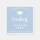Toallas modernas de graduación con "Felicitaciones" y una gorra de grado por encima del nombre del graduado en una elegante y gruesa escritura de escritura junto con el año de clase y el nombre de la escuela en blanco sobre un fondo azul pastel. El fondo puede cambiarse a cualquier color que desee. Estas servilletas son una excelente manera de agregar un toque personal a tu fiesta de graduación.