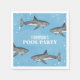 Este bonito diseño presenta una sencilla decoración de fiesta animal azul, una bonita piscina fiesta agua océano, con peces de tiburón acuático, un animal marino, una servilleta fiesta de papel personalizado azul, una bebida de bebida para beber de un cóctel, con vida marina salvaje, con peces de tiburón gris marino, una invitación festiva divertida, estupenda para el verano fiesta de natación divertida, para suministros de fiesta de verano de patio trasero