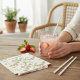 Traslade a sus invitados a un encantador jardín de verano con este diseño de servilletas de papel inspirado en lo vintage. La obra de arte muestra una hermosa disposición de fresas pintadas a mano y margaritas blancas clásicas, acentuadas por un exuberante follaje. Este patrón es ideal para celebraciones al aire libre, fiestas de compromiso, o cualquier evento donde desee infundir un sentido de belleza natural y atractivo atemporal. La encantadora estética de acuarela añade un toque único y artístico que elevará la presentación de sus mesas y creará una experiencia gastronómica memorable para todos sus asistentes.