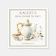Servilletas temáticas vintage y elegantes para té de despedida de soltera. Las servilletas se pueden personalizar con la inclusión de los detalles de su despedida de soltera. El diseño cuenta con una tetera vintage, tazas y platillos de porcelana y un ramo bonito y dulce de margaritas.