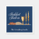 La servilleta de Shabbat Shalom en bello azul con escritura elegante encima de una encantadora cena de Shabbat con pan, vino y velas de shalah. Que tengas muchas bendiciones. Personalice esta decoración fiesta con su nombre familiar para un buen sabbat.