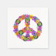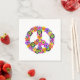 Esta servilleta de papel tiene un signo de paz floral en tonos rosa, turquesa, amarillo, naranja, morado, verde y negro.