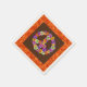 Esta servilleta de papel muestra un signo de paz floral en tonos rosa, turquesa, amarillo, naranja, morado, verde y negro. Un resumen en tonos naranjas proporciona un marco.