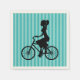 Un lindo ilustracion retro gráfico. Una silueta de una mujer con cola de caballo, vestida con un vestido y montada en bicicleta. El fondo es de rayas azul turquesa con tonos claros y oscuros alternados.