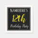 Este sencillo y elegante diseño de servilletas de papel presenta un mensaje como "La fiesta del duodécimo cumpleaños de NameHere", con el "duodécimo" en lujosos textos de color amarillo, dentro de un área cuadrada de color negro con un simple contorno fronterizo. El nombre se puede personalizar. Las servilletas como estas podrían ser usadas en una fiesta de cumpleaños para alguien que está celebrando su duodécimo cumpleaños. [~Z0000150]