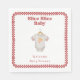 "rebanar a bebé" pizza con tema de ducha de bebé con ilustracion de traje de bebé con mangas rayadas rojas y ilustracion de pizza en el centro. El borde es un diseño de tablero de ajedrez rojo dibujado a mano con esquinas redondeadas.