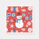 Un lindo muñeco de nieve con un gorra rojo y negro, y una bufanda azul claro sobre un fondo rojo con copos de nieve.