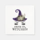 Las servilletas ideales para tu fiesta de Halloween o despedida de soltera con tema de Halloween. Cuenta con una cara de bruja linda (un sombrero de bruja morado con un ramo blanco y dorado sobre un par de cejas arqueadas y párpados maquillados con brillo plateado). Abajo, el texto negro dice "¡Beban, brujas!" en una fuente adecuadamente espeluznante.