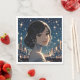 una sonriente anime con el pelo corto y ondulado. Lleva puesto un vestido que no lleva el hombro, lo que le da un ambiente relajado y de ensueño. El ambiente general es tranquilo y nostálgico, lo que refleja perfectamente la esencia de la estética baja-fi.