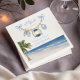 Adorable baby shower design featuring a sweet nautical clothesline with baby shorts, a bib, and a life preserver in soft blue watercolor tones. The tropical palm tree, sandy beach, and ocean waves create a breezy coastal feel, while the light blue palette adds a fresh and charming touch for a baby boy celebration. This design is perfect for a beach, coastal, tropical, seaside, or summer baby shower and uses broad, search-friendly keywords to help reach a wider audience.