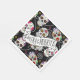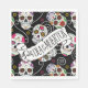 A colorful paper napkin design for Day of the Dead festivities, featuring a variety of decorative sugar skulls with flower and swirl accents on an optional black background. If preferred, the provided 'Feliz Dia de los Muertos' banner and text layer can be deleted to use this design for other occasions. Search ID725 to see other color choices and products with this fun pattern.