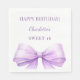 A white background color. Decorated with a large lavender colored bow. Personalize and add the name and date. Text: Happy Birthday!