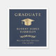 Servilletas elegantes de fiesta de graduación de color azul oscuro con una tapa de graduado dorada, "Graduado" y el nombre del graduado, escuela y año de clase en tipografía serif clásica.