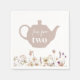 Una tetera rosa con una tipografía de "té para dos" en el interior, junto con una delicada acuarela pintada de flores silvestres en el fondo. ¡Perfecto para tu fiesta de té de cumpleaños!
