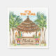 Las servilletas para cócteles con tema de luau tropical presentan un bar Tiki de acuarela en la playa (completo con un loro y cócteles) enmarcado por palmeras, antorchas Tiki y tótems con leyendas "Aloha" y "It's Tiki Time" en fuentes de estilo isleño. Los nombres y la leyenda se pueden personalizar.