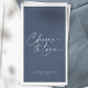 Celebre el amor con esta elegante servilleta de papel para boda que presenta la frase "Brindis al Amor" en una fuente de escritura elegante. El fondo azul profundo con letras blancas crea una apariencia atemporal y sofisticada. Personalizada con los nombres de la pareja y su fecha especial, esta servilleta agrega un toque romántico y refinado a cualquier recepción de boda, fiesta de compromiso o celebración de aniversario. Perfecta para agregar elegancia a su evento mientras ofrece un detalle práctico y elegante para sus invitados.