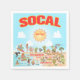 Una escena luminosa y colorida ofrece una vista espectacular del sur de California - personajes adorables disfrutan del cálido sol de California mostrando los parques de Los Ángeles, San Diego, Riverside, Palm Springs y Anaheim con Anza Borrego y Joshua Tree, así como las ciudades fronterizas de Tijuana, Tecate y Mexicali. Esta encantadora escena lo tiene todo: un surfista cuelga diez mientras una sirena se alza sobre una roca, una ballena asesina salta del agua, animales del zoo saludan a los turistas, una pareja de playa muscular flexa para impresionar mientras un T-Rex ruge un desafío y un tanque se mueve en posición y mucho más...