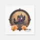 Transporte gótico con Ravens y Rosas. Un carruaje de estilo gótico jalado por dos cuervos con sombreros altos, colocado dentro de un marco circular dorado. El carruaje está decorado con flores y tiene una cruz encima. El fondo es un verde oscuro y texturado, y el marco está rodeado de rosas rojas y florecimiento dorado decorativo. El ambiente general es oscuro, elegante y un poco caprichoso.