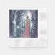 Una mujer elegante, con un vestido de rosa rosa, se levanta ante una puerta mística iluminada por la luna rodeada de luz etérea y flora encantada. Su espalda se ha vuelto, como si estuviera a punto de entrar en un reino mágico más allá de la arcada ornamentada. La escena mezcla elegancia con fantasía, invitando al espectador a imaginar los secretos que yacen al otro lado.