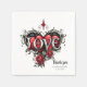 Un romance gótico. Marco gótico ornamentado que rodea un fondo beige. Roses rojos con hojas de color verde oscuro se organizan alrededor del marco, sobre todo en las esquinas. En el centro inferior hay un emblema decorativo en forma de corazón con la palabra "AMOR" inscrita en una fuente estilizada.