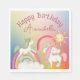 Estas servilletas fiestas personalizados presentan un tema mágico y encantador. El fondo es un patrón de gradiente arcoiris. En la parte superior se retratan dos unicornios bonitos con arcos de lluvia, nubes y el sol. Un ejemplo de mensaje de cumpleaños feliz y el nombre se imprimen en una fuente rosa bonito. Puede personalizar las servilletas para incluir su propio nombre o texto personalizado.