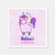 Toallas de papel de cumpleaños con un caprichoso dibujo de un unicornio rosa fresco y funky que tiene una forma y un cuento morado. Esta criatura linda lleva gafas de sol en forma de corazón y está decorada con pequeñas estrellas. Fondo de color de agua rosa.